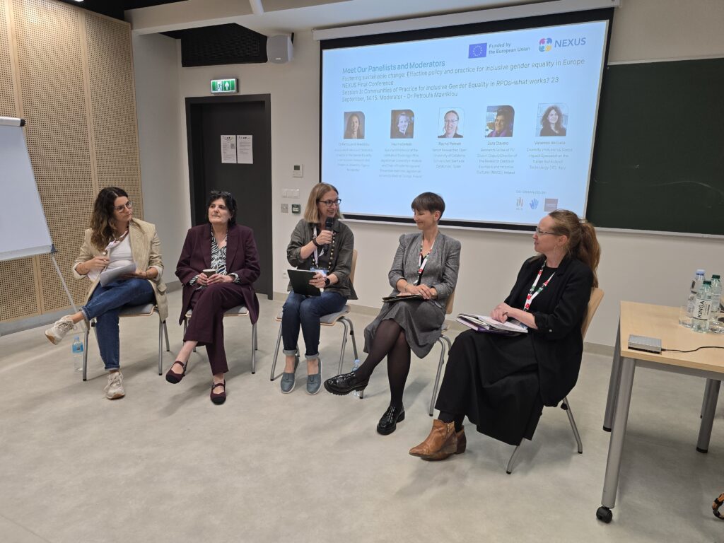 The third session of the NEXUS Final Conference brought together inspiring experiences and lessons learned from Communities of Practice (CoPs) working to advance inclusive gender equality in research performing organisations (PROs) with moderator Petroula Mavricou from Frederick University.