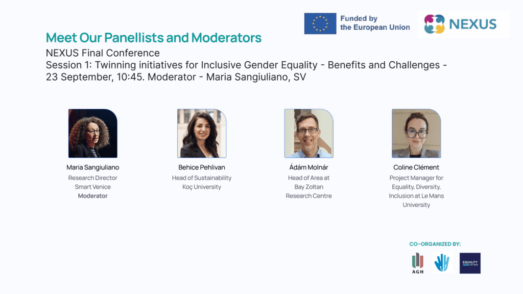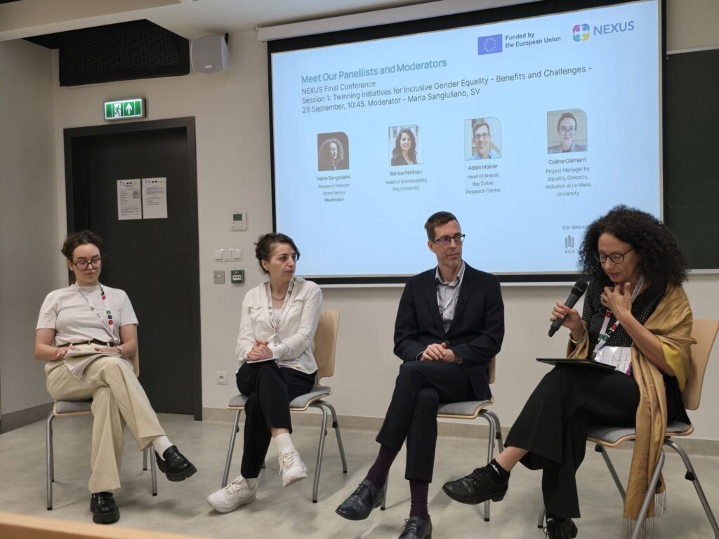 The NEXUS Final Conference began with an inspiring discussion moderated by Maria Sangiuliano (Smart Venice, Italy). The session explored how twinning initiatives serve as powerful tools to strengthen collaboration, exchange good practices, and foster institutional change towards inclusive gender equality in research organisations across Europe.
